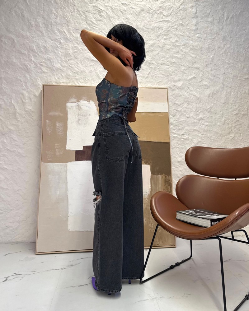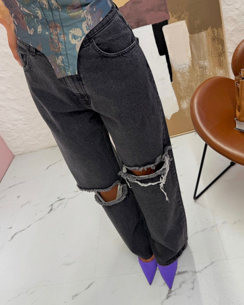 Damskie jeansy z wysokim stanem i przetarciami na kolanach. Luźny, szeroki krój typu wide leg idealny do codziennych, modnych stylizacji.