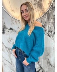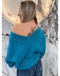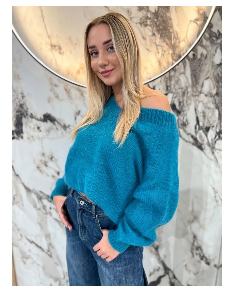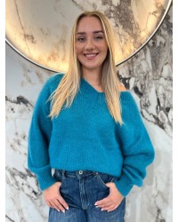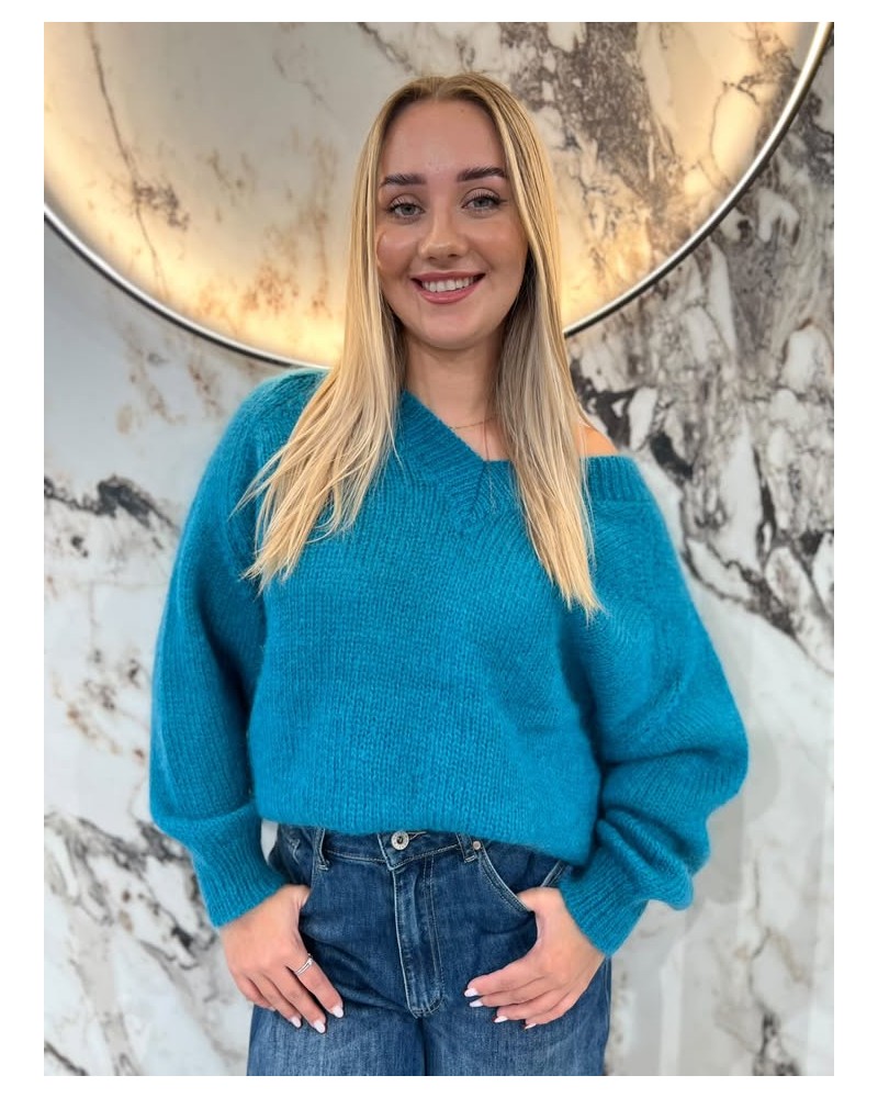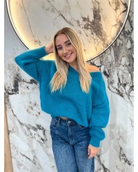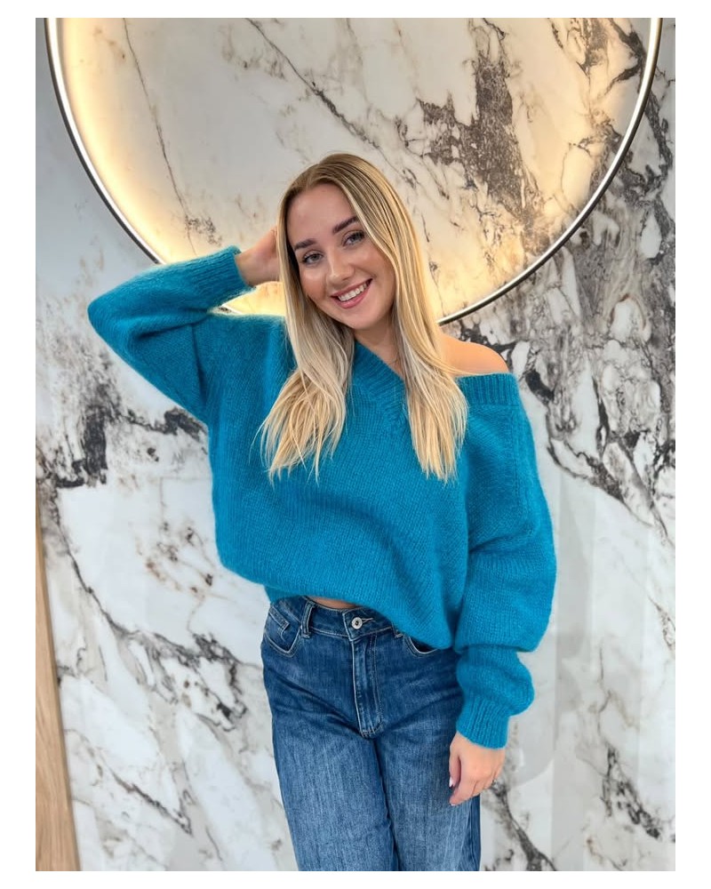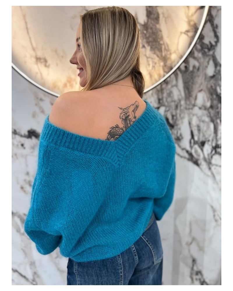 Sweter moherowy z dekoltem w serek, o klasycznym splocie i wygodnym fasonie. Idealny na chłodniejsze dni.