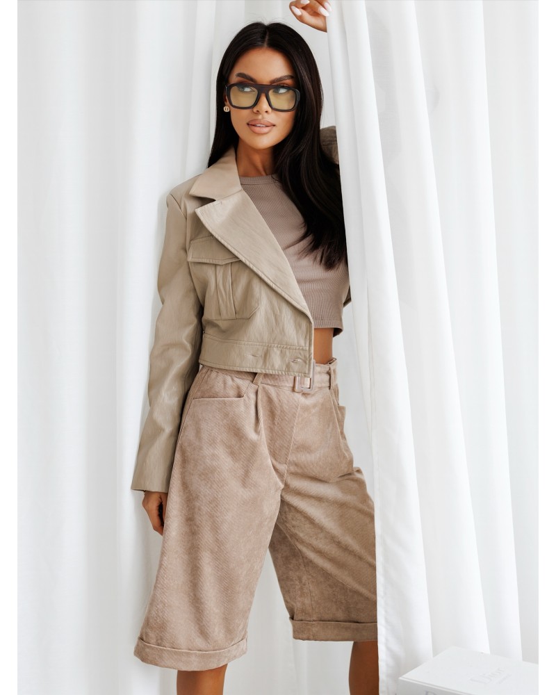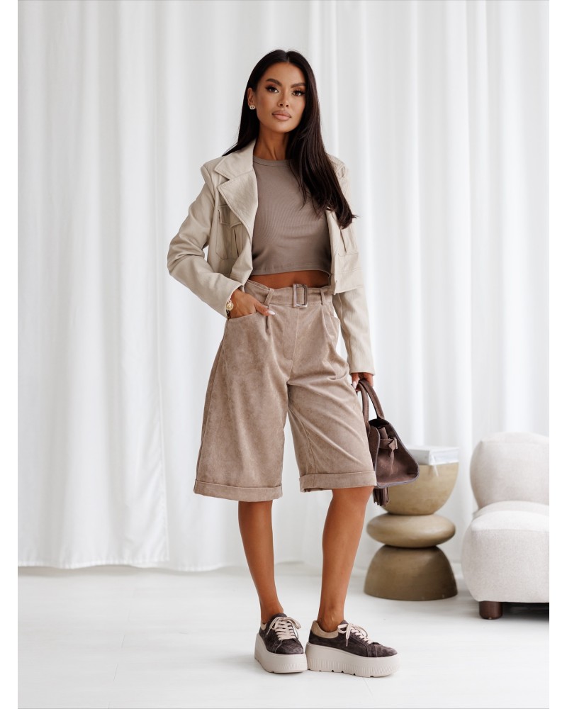 Stylowe szorty z prążkowanej tkaniny to must-have w szafie każdej miłośniczki mody. Model z wysokim stanem pięknie podkreśla talię, a dołączony pasek z klamrą pozwala na idealne dopasowanie. Luźniejszy krój nogawek zapewnia wygodę noszenia i swobodę ruchów, a wywijane nogawki nadają całości lekko nonszalanckiego charakteru. Kieszenie po bokach dodają funkcjonalności. Te szorty to doskonały wybór zarówno na co dzień, jak i na bardziej eleganckie wyjścia w połączeniu z botkami lub kozakami