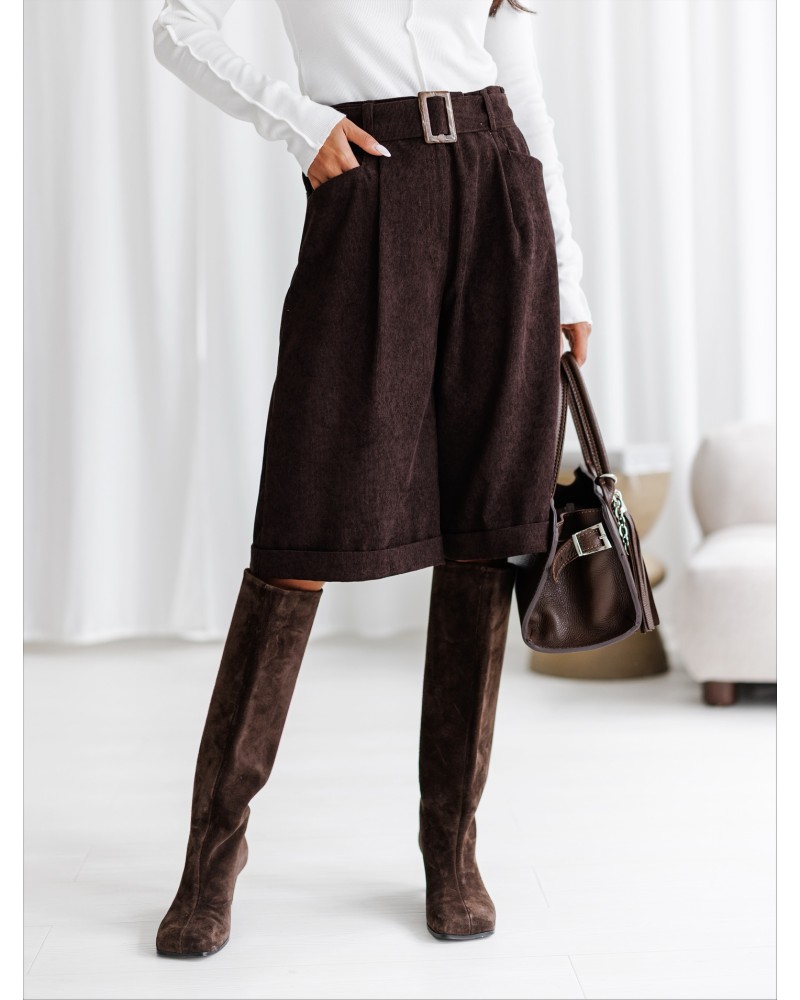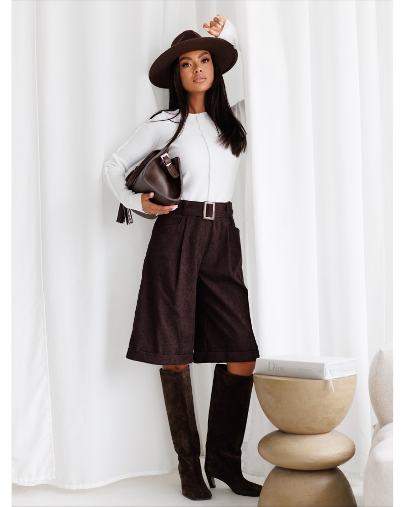 Stylowe szorty z prążkowanej tkaniny to must-have w szafie każdej miłośniczki mody. Model z wysokim stanem pięknie podkreśla talię, a dołączony pasek z klamrą pozwala na idealne dopasowanie. Luźniejszy krój nogawek zapewnia wygodę noszenia i swobodę ruchów, a wywijane nogawki nadają całości lekko nonszalanckiego charakteru. Kieszenie po bokach dodają funkcjonalności. Te szorty to doskonały wybór zarówno na co dzień, jak i na bardziej eleganckie wyjścia w połączeniu z botkami lub kozakami