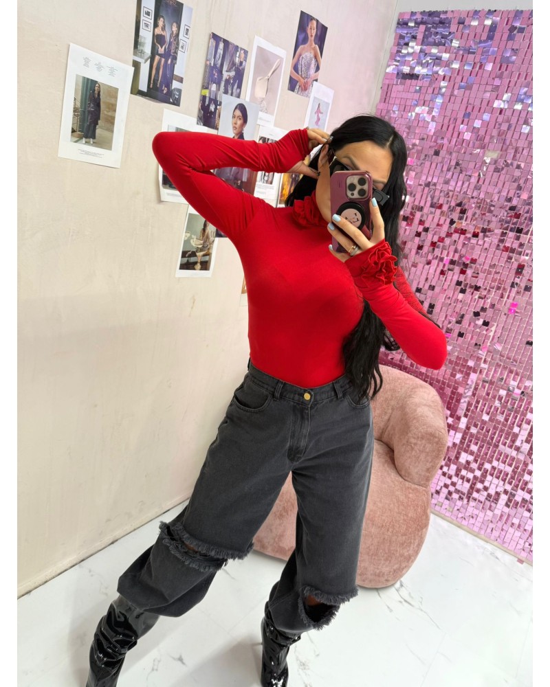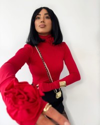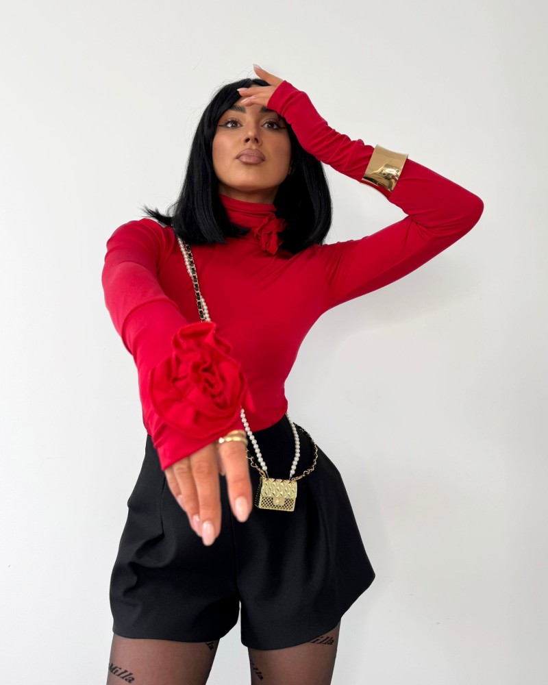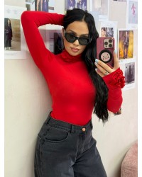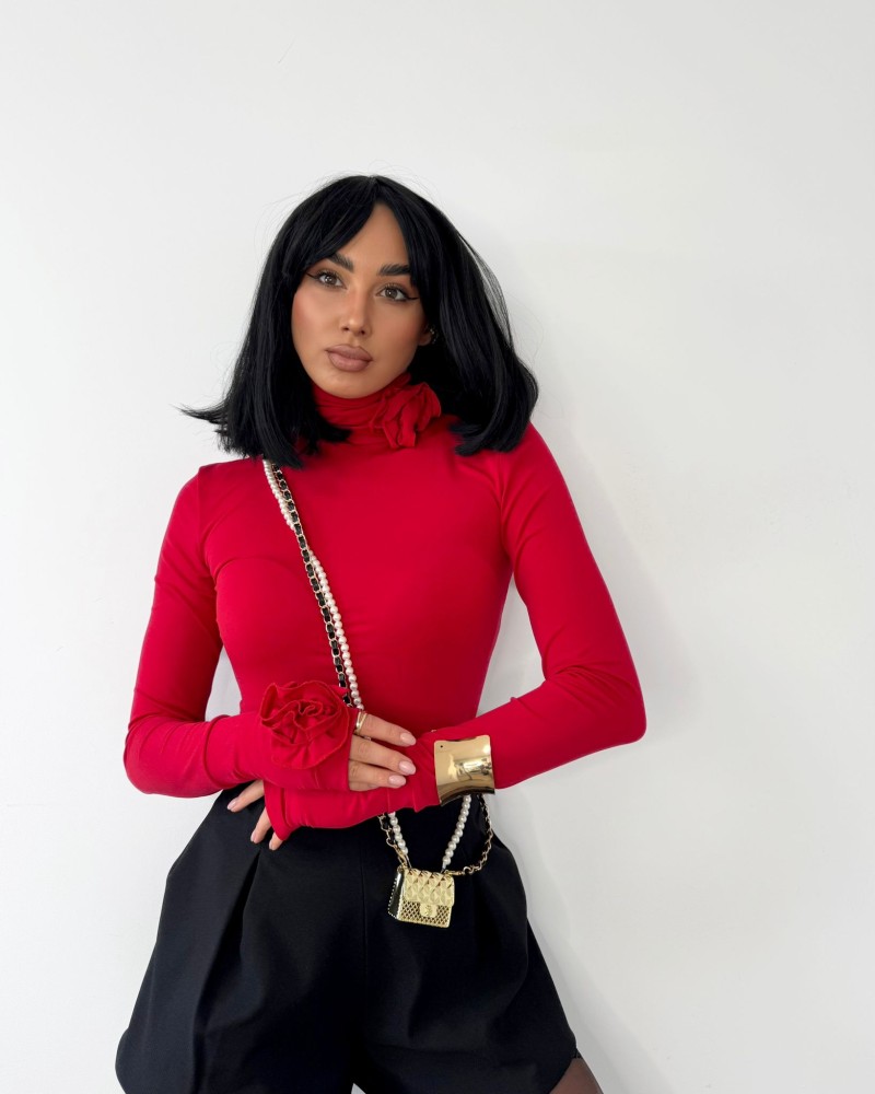 Golf z delikatnymi różami przy szyi i na rękawach to połączenie klasyki z subtelnym romantyzmem. Wykonany z miękkiego, elastycznego materiału, doskonale dopasowuje się do sylwetki, podkreślając kobiece kształty.