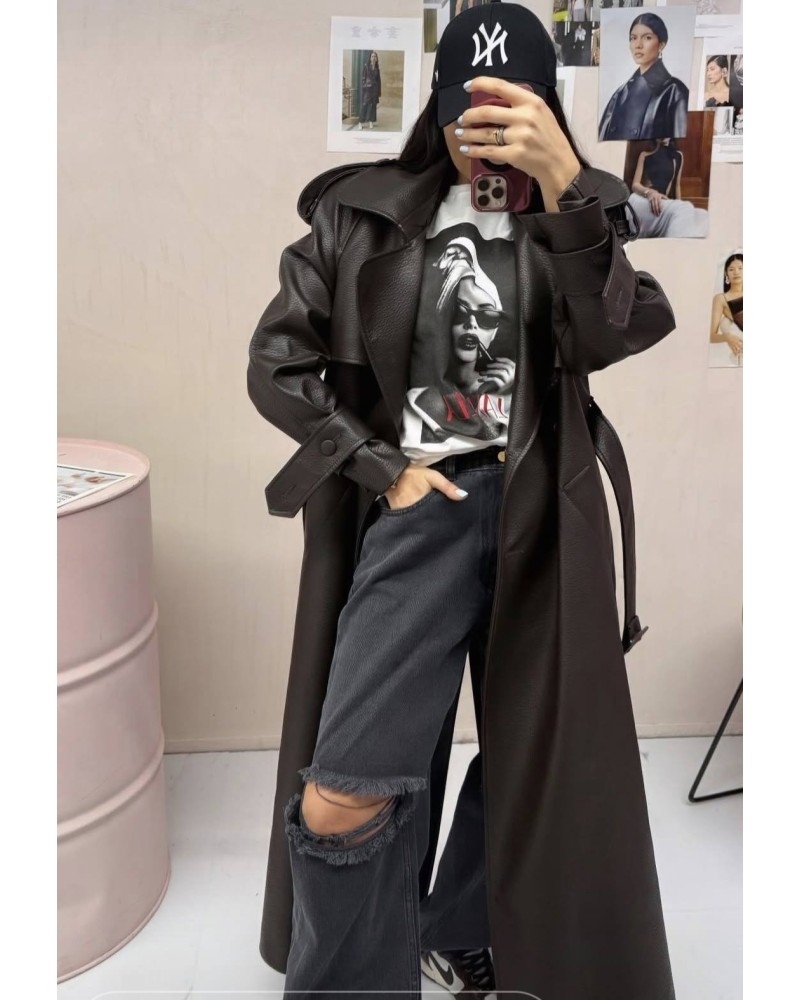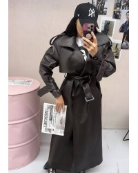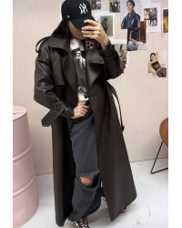 Długi płaszcz z eko skóry to propozycja dla kobiet, które lubią wyróżniać się stylem. Wykonany z wysokiej jakości, lekko połyskującej skóry ekologicznej, przyciąga wzrok i dodaje charakteru każdej stylizacji. Klasyczny, wydłużony fason z dużym kołnierzem i wiązaniem w talii pięknie podkreśla sylwetkę, tworząc efekt „power look”.