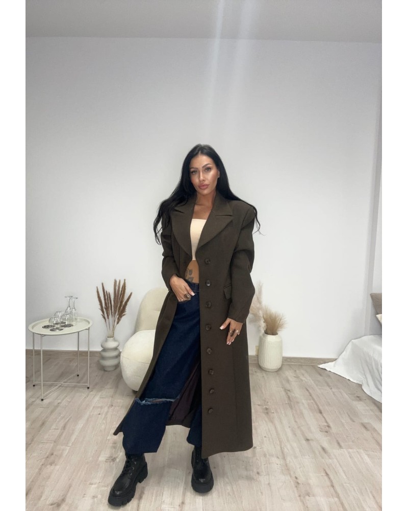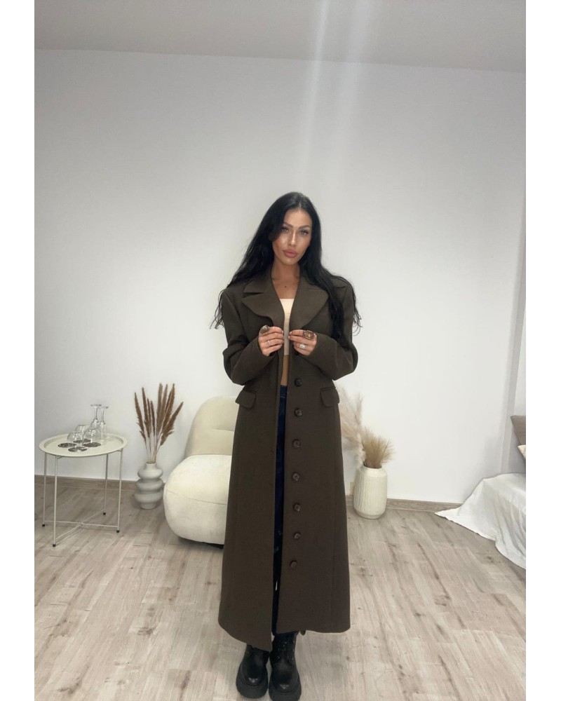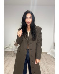 Model posiada klasyczny kołnierz, prosty fason oraz efektowne, równo rozmieszczone guziki na całej długości, które stanowią nie tylko praktyczne, ale i stylowe wykończenie. Dwie eleganckie klapowe kieszenie dodają całości struktury, a lekko zaznaczone ramiona optycznie modelują sylwetkę.