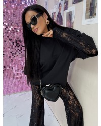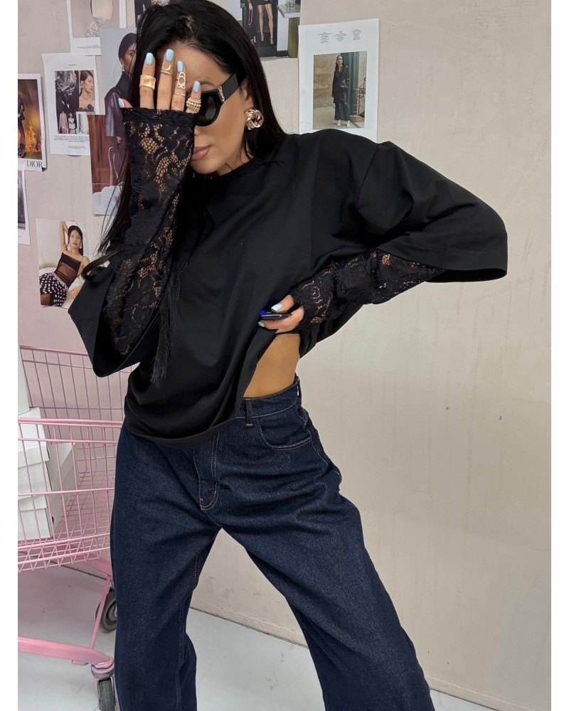 Ta bluzka to idealna propozycja dla osób, które cenią minimalizm z nutą elegancji. Klasyczna forma została przełamana efektownymi rękawami z dekoracyjnej koronki, które przyciągają wzrok i dodają całości kobiecego, wyrafinowanego charakteru.