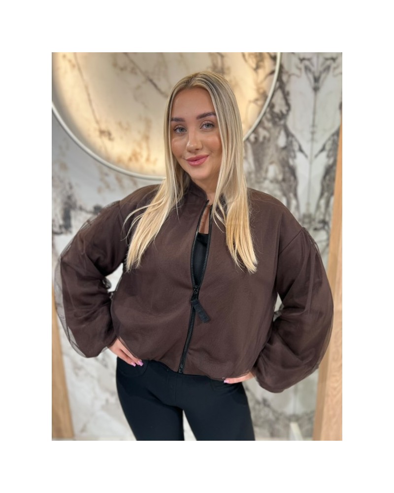 Nowoczesna bluza zapinana na suwak z wyjątkowym akcentem w postaci tiulowych, bufiastych rękawów. Lekko oversize’owy krój zapewnia komfort i swobodę ruchów, a transparentne rękawy nadają całości lekkości i elegancji. Idealna propozycja na co dzień, do pracy lub na wieczorne wyjścia — wystarczy dodać ulubione spodnie lub spódnicę. Ta bluza to świetny wybór dla kobiet, które cenią sobie wygodę, ale nie rezygnują z modnych i kobiecych detali.