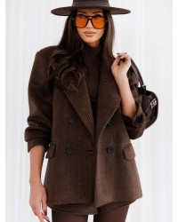 Elegancka marynarka z charakterystycznym wzorem w jodełkę to propozycja dla kobiet ceniących klasykę w nowoczesnym wydaniu. Model zapinany na dwurzędowe guziki, z wyraźnie zaznaczoną talią i wykończeniem inspirowanym tradycyjnym krojem garniturowym. Miękki, przyjemny w dotyku materiał zapewnia komfort noszenia, a strukturalny wzór dodaje charakteru. Sprawdzi się doskonale w stylizacjach biznesowych, casualowych oraz jako modny dodatek do jeansów.