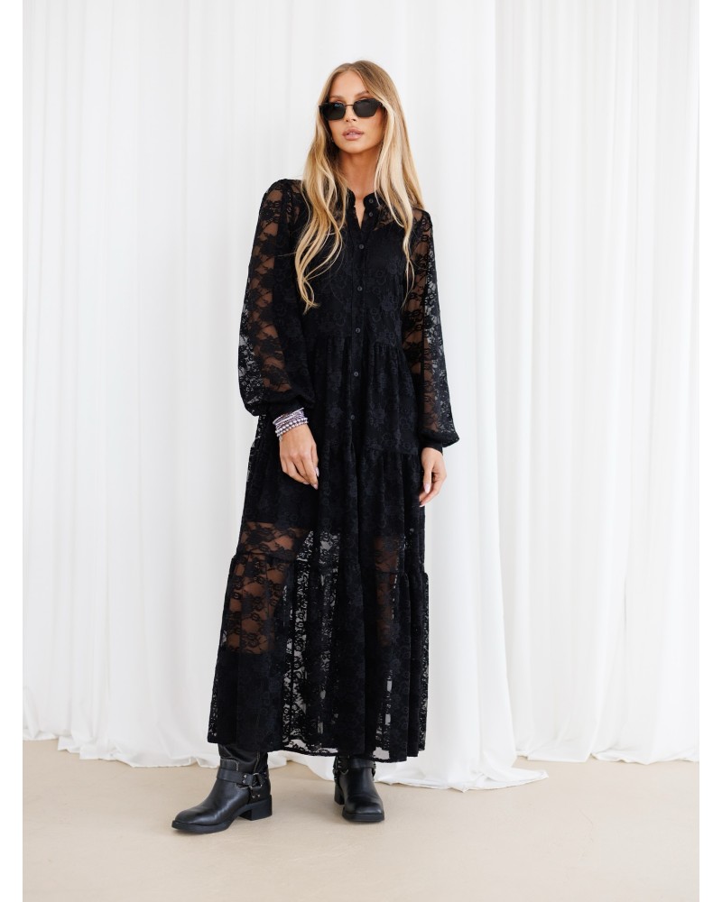 Koronkowa sukienka maxi o zwiewnym kroju z długim rękawem i eleganckim wykończeniem. Idealna na wyjątkowe okazje i codzienne stylizacje w stylu boho.