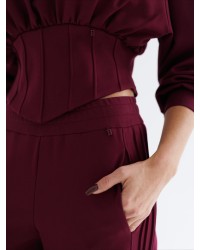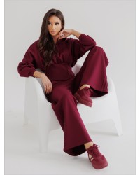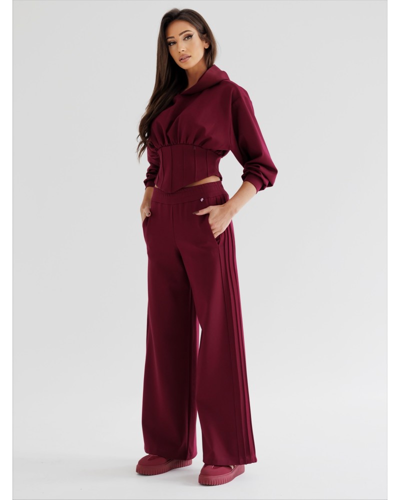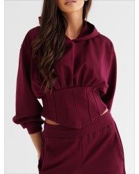 Modny komplet dresowy, który łączy wygodę z nowoczesnym stylem. Bluza z kapturem o luźnym kroju została urozmaicona efektownym ściągnięciem w talii, które pięknie podkreśla sylwetkę. Spodnie z wysokim stanem i elastyczną gumką w pasie zapewniają maksymalny komfort noszenia. Całość wykonana z miękkiej, przyjemnej w dotyku dzianiny, która doskonale układa się na ciele. Idealny zestaw na co dzień, do pracy w trybie home office, spacer czy weekendowy wypad. Dostępny w kilku modnych kolorach: bordo, czekoladowym i czarnym.