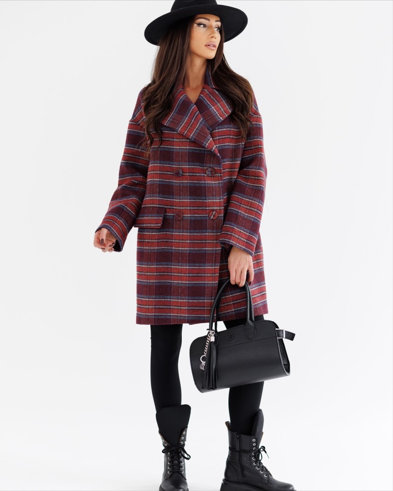Stylowy płaszcz w kratę o klasycznym kroju z klapami i kieszeniami. Idealny na chłodniejsze dni – modny i ponadczasowy.