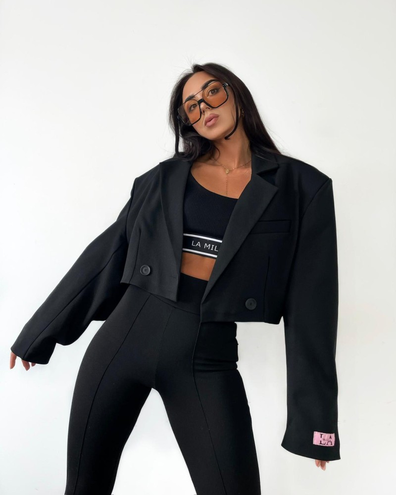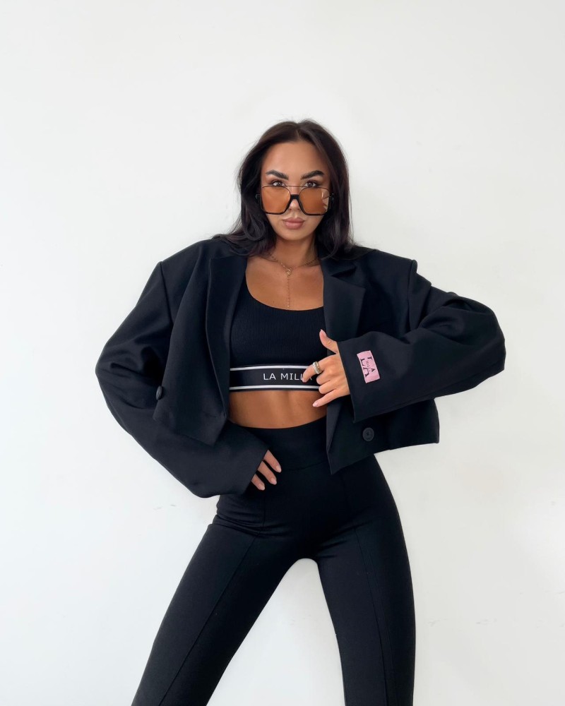 Czarna krótka marynarka o oversize’owym kroju – nowoczesny, modny fason z szerokimi rękawami i minimalistycznym designem.