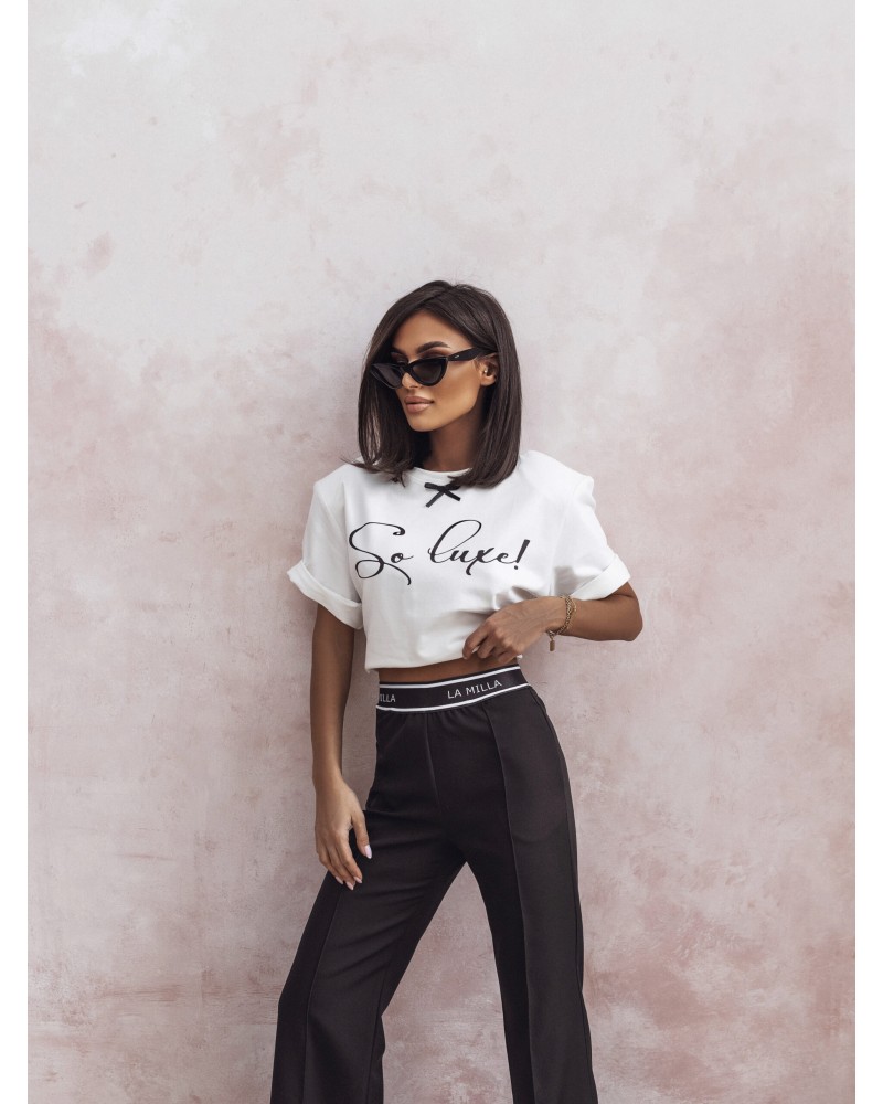 Stylowy T-shirt oversize od La Milla z napisem „So luxe!” i uroczą kokardką przy dekolcie 🎀 Idealny do codziennych, kobiecych stylizacji – wygodny, a jednocześnie wyjątkowy 💕