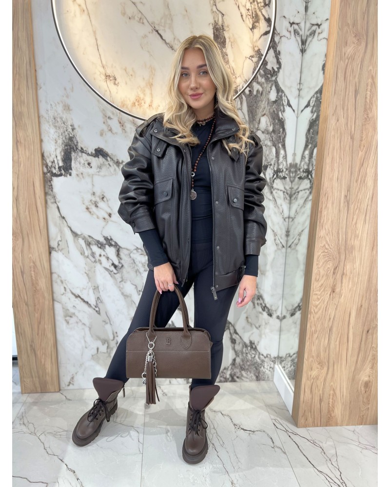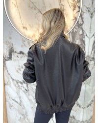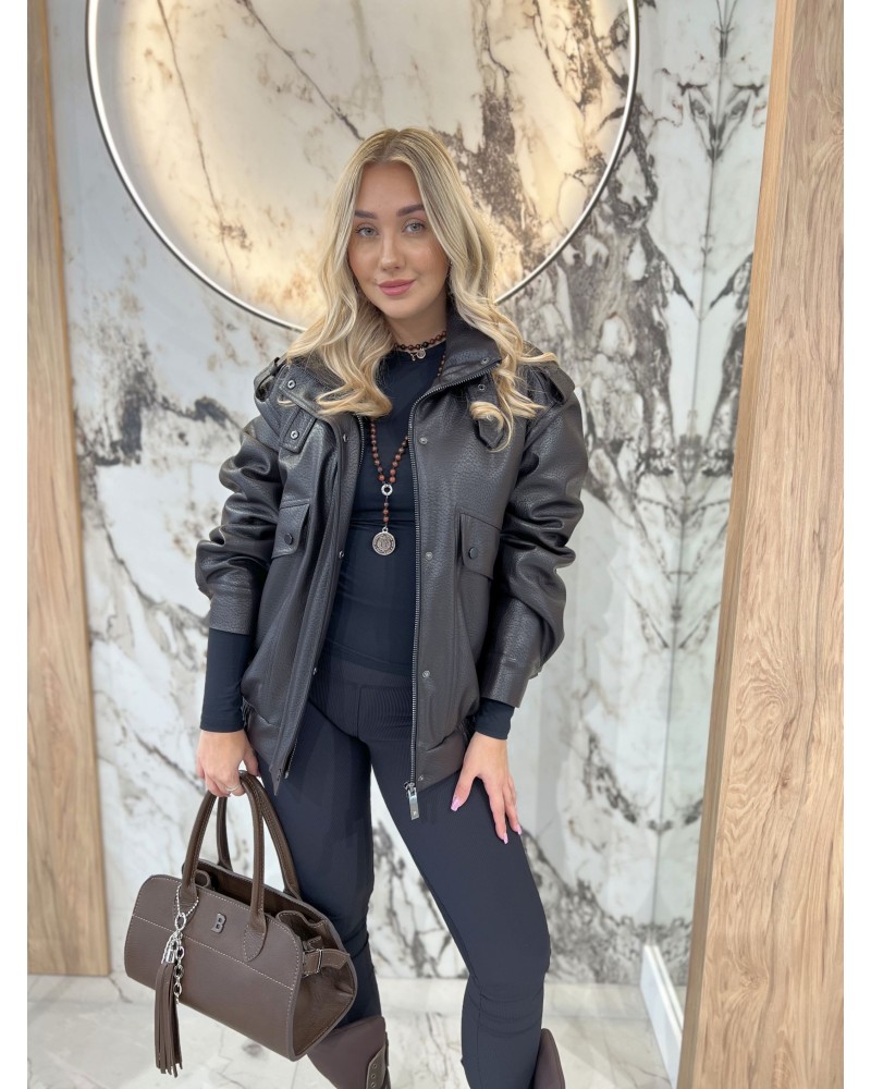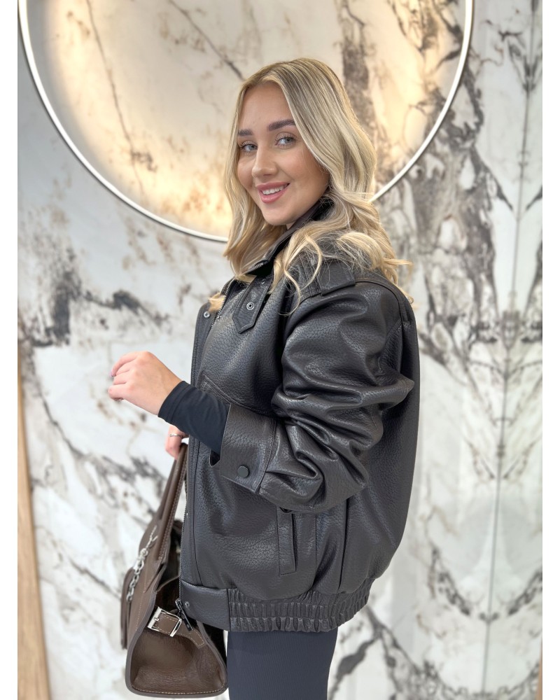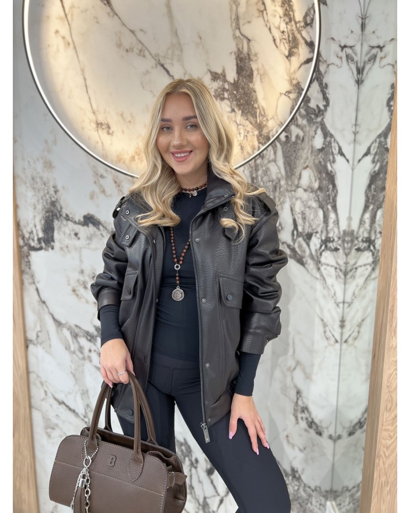Stylowa kurtka o klasycznym kroju wykonana z wysokiej jakości materiału imitującego skórę. Wyposażona w praktyczne kieszenie i stójkę z zapięciem. Idealna propozycja dla miłośników ponadczasowych, eleganckich fasonów.