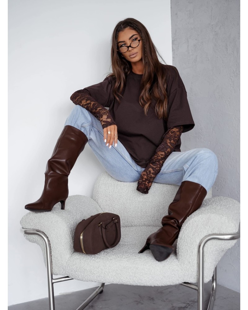Stylowy t-shirt o luźnym kroju z efektownymi koronkowymi rękawami. Połączenie casualowego stylu z eleganckim wykończeniem tworzy wyjątkowy i modny look idealny na każdą okazję.