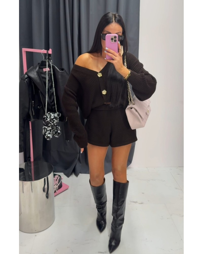 Stylowy komplet dzianinowy z guziczkami, składający się z swetra i krótkich spodenek. Idealne połączenie kobiecego stylu, wygody i nowoczesnego designu – doskonały zarówno na co dzień, jak i na wyjątkowe okazje.